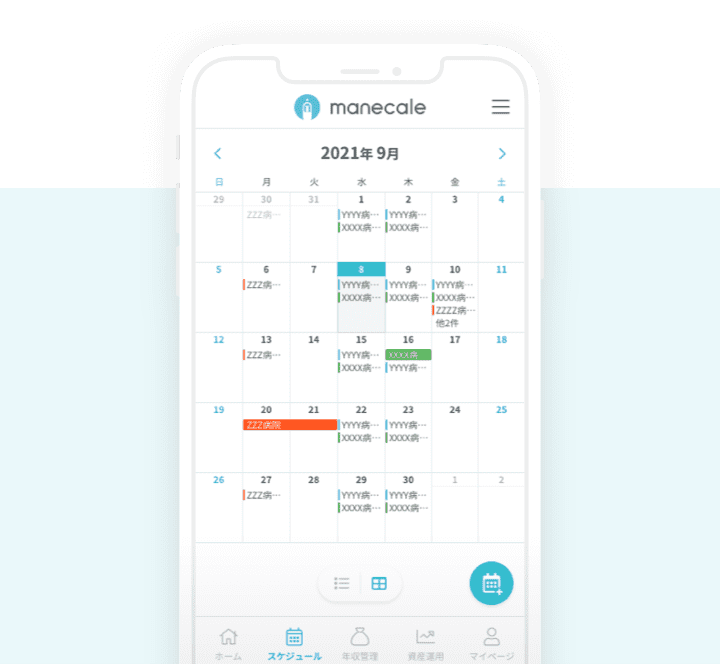 固定の勤務の他にスポットでの外勤、医局や研究・産業医としての勤務など、医師のスケジュールは一般的な会社員とは異なります。単純な予定の登録だけではなく、勤務先を連動して登録し、収入管理とも連動して予定と収入、両方をまとめて管理します。