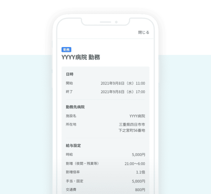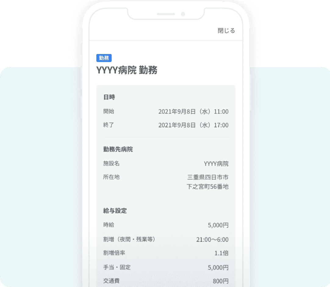 スポット勤務なども含めた外勤先も、勤務先として管理。勤務先ごとに給与形態を登録できるから、スケジュール登録時に勤務先を選ぶだけで勤怠と給与を同時に登録できます。勤怠に合わせて給与が自動計算されるので、あとは何もしなくとも年収に反映されます。